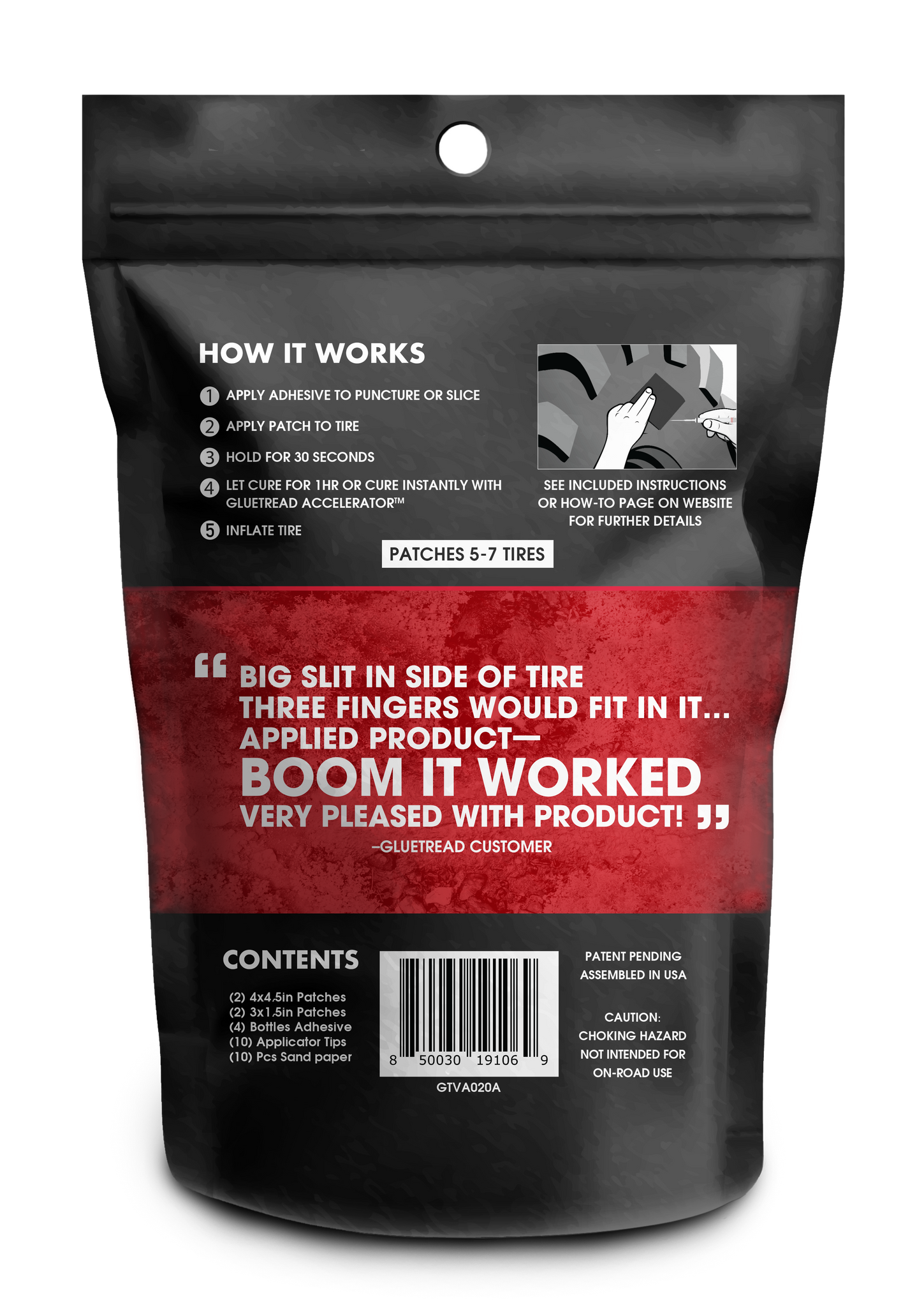 - Fast Repairs: With GlueTread's improved rubber formula, repairs are cured in just 10 minutes and ready to inflate.