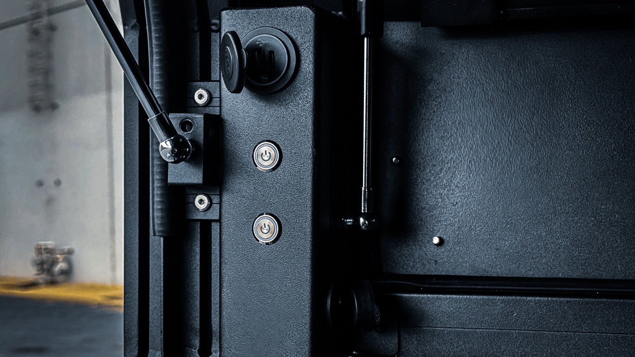 Dual extruded-aluminum gullwing doors with recessed frames and deep automotive-grade seals block out dust and water even in the roughest conditions.